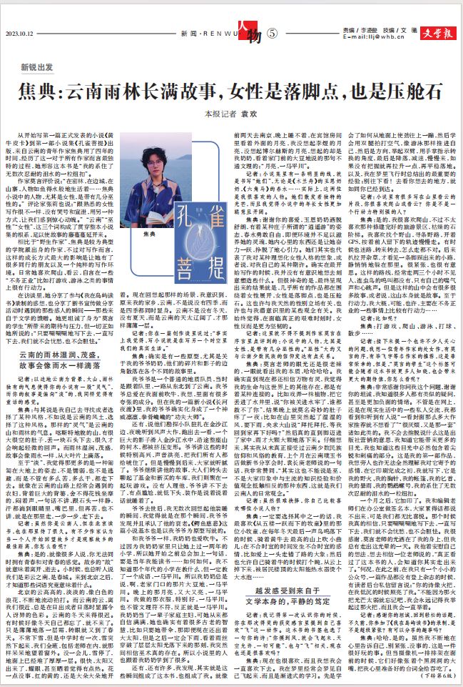 而在新媒體的環境下,青年作家公開表達自我的途徑明顯增多了,比如正在成為新的宣傳場域的小紅書等平臺,顯然更具預見性,有很多作家是從新媒體平臺被發現,轉向傳統期刊,各自為中心,攜帶著新的知識和經驗,也被寄予誠摯的求新的愿景。那報紙、期刊的獨特性在哪兒呢?我想到的是為了避免快速時代新媒體的“一閃而過”,一種長期系統性的專業性的觀察仍然具有獨特的作用,我們試圖在碎片化中構建意義,尋找青年寫作另一重遼闊之地。為此,《文學報》設有“新銳出發”和“青年漫談計劃”兩個常規欄目,前者從單人訪談出發,探尋青年作家文學之路上的創作痕跡;后者則通常由作家與作家/評論家從一些日常話題出發,進行對話,由此打開文學與生活的深度聯結。