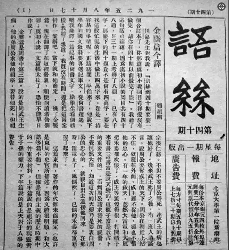 1924年11月2日下午,北平東安市場的開成素餐館有一個文人雅聚:周作人,錢玄同,江紹原,章川島,孫伏園,顧頡剛,李小峰。與會者章川島回憶,聚餐的目的是“決定出一個周刊,大家寫稿,印刷費由魯迅先生和到場的七個人分擔,每月每人八元??锏拿Q大家一時都想不出來,就由顧頡剛在帶來的一本《我們的七月》中找到‘語絲’兩字,似可解不甚可解,卻還像一個名稱,大家便同意了,就請錢玄同先生題簽”。(《說說〈語絲〉》,《文學評論》1962年第4期)攜帶《我們的七月》的顧頡剛也印證了這一說法。他在當天日記中寫道:“命名久不決,予看平伯詩中有‘語絲’二字,頗寫意,不落褒貶,提出之,通過?!保ā额欘R剛日記》卷一,第548頁,中華書局2011年出版)“寫意”是跟“寫實”相對的一個藝術術語,在語言表達上有遮言和隱喻,令人聯想翩翩?!安宦浒H”是說“語絲”二字是中性詞,作為刊名無具體針對性,能擴大讀者群。
