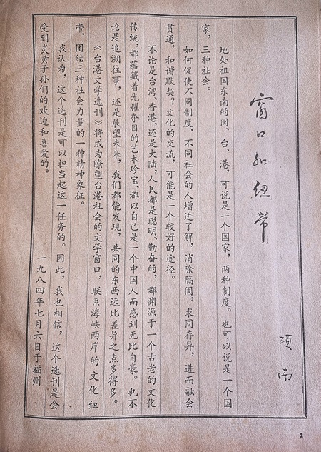 永遠銘記于心的是,1984年7月6日,時任福建省委書記項南為《臺港文學選刊》撰寫了代發刊詞《窗口和紐帶》,言簡意賅地闡明了《臺港文學選刊》的性質、意義和作用。他指出:“如何促使不同制度、不同社會的人增進了解,消除隔閡,求同存異,進而融會貫通,和諧默契?文化的交流,可能是一個較好的途徑?!彼诖?,“《臺港文學選刊》將成為瞭望臺港社會的文學窗口,聯系海峽兩岸的文化紐帶,團結三種社會力量的一種精神象征”,“這個選刊是可以擔當起這一任務的。因此,我也相信,這個選刊是會受到炎黃子孫們的歡迎和喜愛的”。