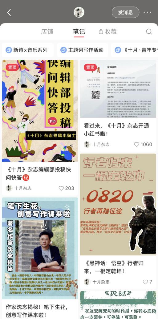 其實,在近兩年的雜志宣發工作中,小紅書正是《十月》的一張亮眼名片。自2023年夏天創設以來,“十月雜志”小紅書號始終以輕松、活潑的形式推送文學作品和文壇訊息,運營一年內粉絲數已經超過1.8萬,打造了多篇爆款推文,并于2023年年底榮獲“第九屆年度書業營銷推選”最受歡迎新媒體賬號。在專題策劃方面,我們首創推出了“文化探店系列”——以短視頻的形式帶領讀者線上“種草”全國各大城市的特色書店,比如北京的萬圣書園、三聯韜奮書店、涵芬樓書店,南京的先鋒書店等,為讀者探尋精神食糧。執行主編季亞婭認為,作為傳播載體的文學期刊有其獨特的媒介屬性,它介于圖書出版和報紙傳媒之間,比圖書周期更短、能夠更加靈活地組稿,較報紙周期更長、能夠承載更具深度的內容。而小紅書是近幾年來廣受年輕受眾歡迎的新媒體,也已經是中文互聯網最便捷的資訊搜索、傳播工具之一,我們可以最大限度地利用其媒介屬性和特點,以辦報紙的意識來運營新媒體,及時關注文學圈各種最新資訊,將其呈現給受眾用戶。
