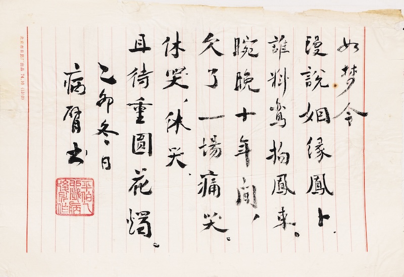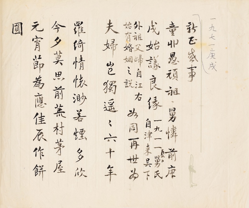 72歲的俞平伯想起了60年前的往事,對著夫人許寶馴,在一張信紙上用毛筆工整地寫下兩首《新春感事》: