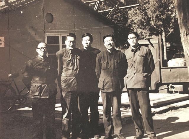 在《文藝報》簡易樓前。左起為鄭興萬、謝永旺、寒小風、唐達成、高洪波