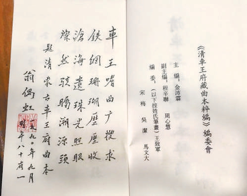 翁偶虹先生家里我們也去過多次,每次拿著大摞的《曲本》去請教,哪些是高腔唱本,哪些是昆曲唱本。很多戲曲唱本中既有京腔,也有高腔,有的還有昆曲曲牌,朱家溍先生將之定義為清中晚期出現的“昆亂不擋”時期的“亂彈”。我們決定遵循朱老的建議,不用京劇的名稱,改稱此類為“亂彈”,以反映京劇在北京的發展與演變過程。書即將出版的時候,我們請翁偶虹先生題詞,翁先生欣然作詩一首:“車王嗜曲廣搜求,鐵網珊瑚歷歷收。滄海遺珠光照眼,燦然駭囑溯源頭?!?/p>