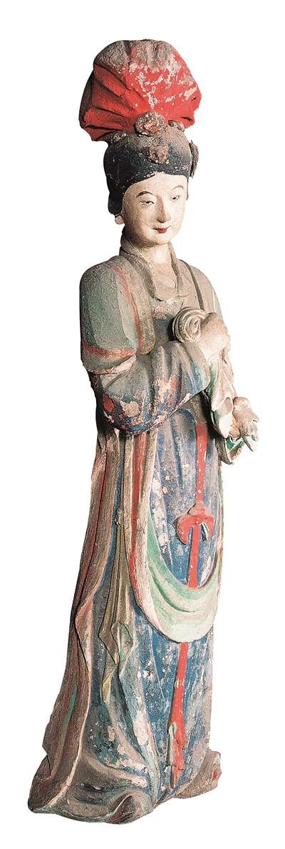圣母殿內完整保存了43尊彩繪泥塑。圣母邑姜像頭戴鳳冠,霞帔珠纓,端莊高貴。42尊侍從像對稱分列于圣母神龕兩側,有的奉文印翰墨,有的灑掃梳妝、奏樂歌舞。這組塑像寫實傳神,對研究宋代宮廷生活、衣冠服飾和彩塑藝術具有重要價值。