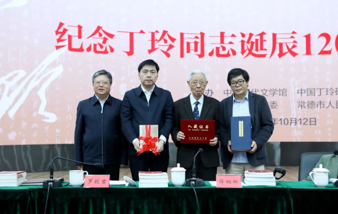 座談會現場還舉行了丁玲手稿展和圖書捐贈儀式?,F場展出了丁玲人生不同階段的代表性照片,以及《建設新中國之文藝工作》《魯迅先生于我》《我所認識的瞿秋白同志》等珍貴手稿。蔣祖林、中國社科院文學所學者何吉賢、河北教育出版社黨委書記董素山共同向中國現代文學館捐贈了《丁玲作品精選集》,中國現代文學館常務副館長王軍接受捐贈并回贈入藏證書。
