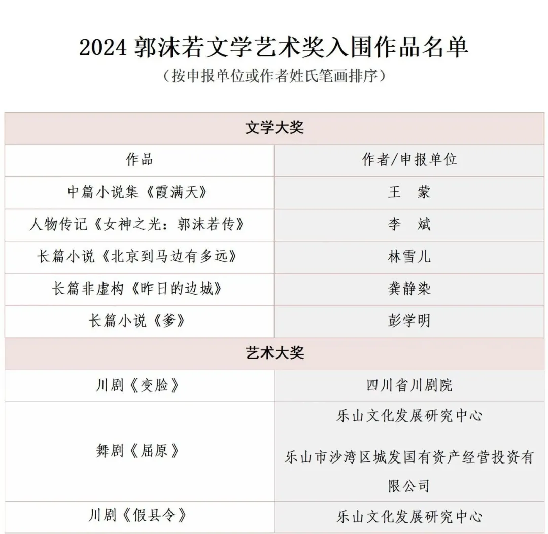 2024郭沫若文學藝術獎設文學大獎、藝術大獎、新人新作獎三個子項,自2024年6月14日發布公告,共征集作品108件,截至目前,已完成各獎項的評審工作,現將入圍作品予以公示,接受社會公眾監督。公示期為5個工作日(即2024年10月14日至10月18日),在此期間,凡對入圍作品的版權、內容和有關問題持有異議者,請以書面或郵件反映的形式(信函以寄出日郵戳為準)向組委會辦公室提出。以單位名義反映情況的材料要加蓋單位公章,以個人名義反映情況的材料要署真實姓名,并提供聯系方式,匿名來信來件不予受理。