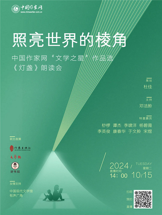 10月15日,中國作家網文學直播間舉辦了“中國作家網‘文學之星’作品選《燈盞》朗讀會”的直播活動。特邀《詩選刊》主編、批評家桫欏,魯迅文學院教研部副主任譚杰,北京電影學院副教授、青年詩人李嘯洋,魯迅文學院教師、青年詩人楊碧薇,《文藝報》編輯、青年評論家康春華,《當代》文學雜志編輯、青年作家于文舲,《燈盞》作者代表宋煜,以及中國作家網編輯、青年作家李英俊,以“照亮世界的棱角”為主題,結合當下文學熱點與具體的文學作品,從選稿與創作、點評與閱讀、出版與傳播等角度展開交流?;顒舆€邀請有聲廣角工作室的朗讀者朗誦《燈盞》中的部分作品,以聲情并茂的朗誦走進文學作品,領略文學魅力?;顒佑芍袊骷揖W編輯鄧潔舲主持。