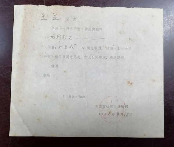 1986年,《語言研究》編輯部函請《中國語文》編輯王顯先生審稿。原件藏湖南大學文學院資料室。