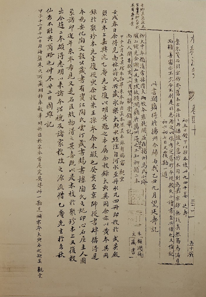 浙江教育出版社2010年版《王國維全集》第十二、十三兩冊,收錄《水經注?!返恼肀?,根據的是吉林大學圖書館收藏的王國維手校本《水經注箋》,各卷之末有??鳖}記。該書卷四十末的題記最為完整:“甲子十二月十二日,用海鹽朱氏所藏明抄本校畢。明抄出于宋本,首尾完具,得此一勘,足補宋本、《大典》本之缺矣。觀堂?!钡缭诔跗呷眨ň砦孱}記),王國維已做出相同的判斷:“甲子十二月初七日,假得明抄本校此二卷。明抄行款與宋本同,當自宋本出也。永觀又記?!贝诵胖饕虼丝梢陨纤莸酵鯂S初校的前幾日,而不必在全書校畢之后。