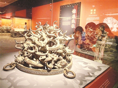 觀眾欣賞曾侯乙墓出土的戰國建鼓銅座。