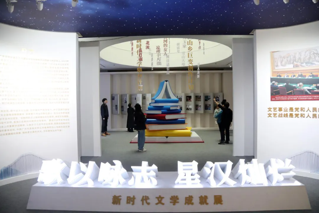 圖為“歌以詠志 星漢燦爛——新時代文學成就展”展廳中央,圍繞中國作協“新時代山鄉巨變創作計劃”和“新時代文學攀登計劃”打造的巨型藝術裝置。中國現代文學館供圖