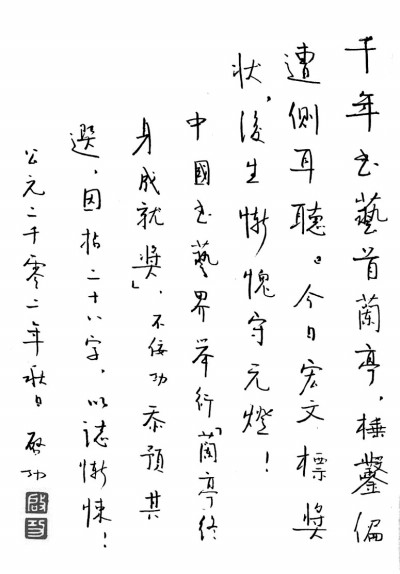 啟功書寫的首屆中國書法蘭亭獎獲獎感言