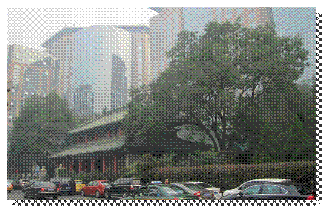 這張照片是我自己拍的,前面這個應該是廡殿頂的建筑吧,這是協和醫學院,后面的大玻璃外墻的是東方新天地,咱們通??吹降臇|方新天地都是從長安街上一側,是它朝南的一面,這是它朝北的一側。協和醫院是一個古香古色的、中國傳統風格的建筑,但是它的背景卻是一個美國式的摩天大樓。我不認為這是一種成功的混搭,反而覺得是一個非常失敗的開發。單獨拿出來這個建筑來說,它們都沒得說,但是因為它是個房子,它周圍是要有鄰居的,那和這個鄰居放在一起,我覺得這個房子就不該在這里,除非把周圍的鄰居都搬走。