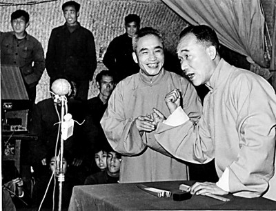 新中國成立后,相聲界對舊相聲進行了凈化語言、提升格調的革新整理。圖為侯寶林和郭全寶演出新相聲。圖片由中國曲協提供
