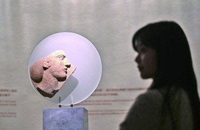 觀眾在觀看古希臘大理石女性頭像浮雕圓盤殘片。新華社發