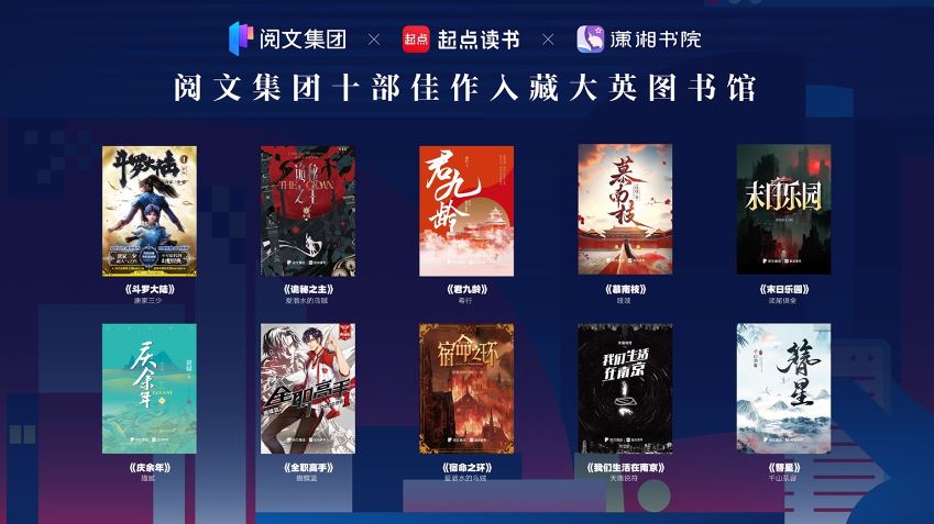 此次入藏大英圖書館的作品包括《斗羅大陸》《詭秘之主》《君九齡》《慕南枝》《末日樂園》《慶余年》《全職高手》《宿命之環》《我們生活在南京》《簪星》,均是中國網絡文學發展20余年的經典代表作品,在海外已翻譯成英語、印尼語、日語、韓語、泰國等多語種。