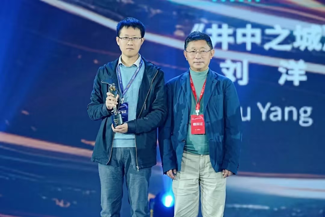 中國作協副主席、四川省作協主席阿來為“天問”獎最佳長篇獲得者《井中之城》作者劉洋頒獎