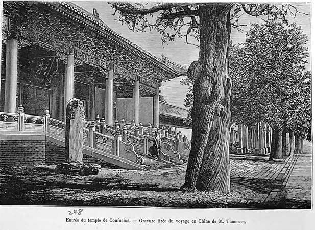 湯姆遜將他在北京的見聞寫入了其著作《中國與中國人影像》(Illustrations of China and Its People)與《鏡頭前的舊中國》(Through China with a Camera)中。在其1898年出版的著作《鏡頭前的舊中國》中,他詳盡記錄了來到北京孔廟與國子監的感受。在湯姆遜的眼中,這里猶如希臘和羅馬的古老神殿一般,是中國經典建筑之作。書中他袒露了對孔子“大道之行也,天下為公。選賢與能,講信修睦”觀點的認同?!耙粋€成功的政府只能由那些才華橫溢、功勛卓著的人組成”,約翰·湯姆遜認為中國政權得以長久延續的原因在于官員的選擇,他認可中國選拔館員的科舉制度,認為這是對有識之士的回報,在他看來,“只有那些學識淵博但又不拘泥于古典的人才能在科舉考試中名列前茅”。