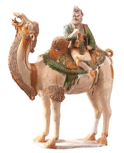 盛唐時期,許多外國人定居中國境內,不少人落戶長安。他們從事各種職業,其中一些人甚至在朝廷中擔任要職。唐代墓葬陶俑中經常出現外國人的形象,是這一時期社會風貌的真實寫照。三彩胡人騎駝奏樂俑出土于西安市長安區。騎在駱駝上的胡人樂師鼻梁高聳,胡須濃密,身穿長袖翻領長袍,足蹬尖頭鞋,側身而坐,雙手各持一支鼓槌,胸前系著一面鼓,仿佛隨時準備擊鼓伴奏、高歌一曲。駱駝頭部高揚,張口嘶鳴,似與樂師和鳴。這件充滿動感的文物,生動塑造了胡人樂師的形象,印證了絲路文化交流。