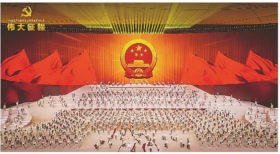 但舞臺藝術電影又不只是亦步亦趨地真實記錄。在他看來,舞臺有一套自己的敘事邏輯,但電影需要建立起電影語言的敘事邏輯。電影導演必須在尊重舞臺敘事的基礎上,運用電影語言構建清晰的鏡頭邏輯。電影導演首先要搞清楚作品所講的內容?!啊秱ゴ笳鞒獭分屑扔幸魳肺璧甘吩姷臄⑹逻壿?,又有背景大屏幕專題片的歷史敘述,兩者在某些段落產生沖突。為此,我們通過大量的鏡頭組織與剪輯工作,明確了每個段落的主題與節奏,使其在銀幕上呈現出結構清晰、層次分明的敘事語言?!痹谝魳愤壿嫹矫?,《偉大征程》作為一部情景史詩、一場沉浸式演出,現場氛圍的營造同樣是需要考慮的。因此在這部電影中,主創團隊錄制了大量的現場環境聲,包括歡呼聲等,后期又錄制了許多音響效果,在錄音棚通過混音重新構建了一個沉浸式的聽覺空間。在舞臺空間與電影視覺呈現的關系方面,侯克明認為舞臺藝術電影需要盡量突破舞臺限制,創造更具電影感的空間。因此在其他幾部作品中,侯克明盡量避免舞臺大幕與側幕條的過多出現,以突破舞臺的局限性。而《偉大征程》有所不同,大量保留了觀眾席的群眾反應鏡頭,并通過舞臺大銀幕中的畫面延展出去,以期更好表達舉國歡慶的熱烈氛圍。