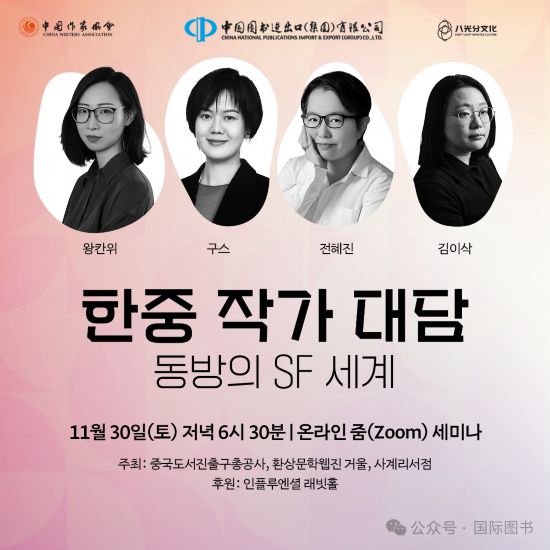 近日,由中國作家協會外聯部指導,中國圖書進出口(集團)有限公司主辦、八光分文化協辦的第二屆中韓科幻作家對話交流活動在線上舉行。作為2024年韓國“中國文學讀者俱樂部”的重要活動,中國科幻作家王侃瑜、顧適,韓國翻譯家、作家金依莎,以及韓國當地出版社編輯、中國文學研究者,對中國文學、科幻作品感興趣的讀者等近30人參加,活動由韓國科幻作家全慧珍主持。