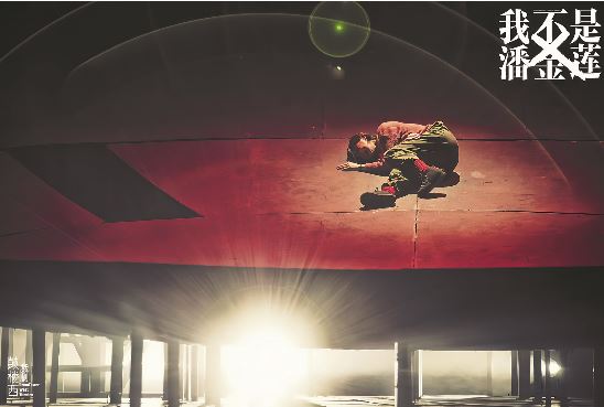 除了舞美和道具,燈光是《一日三秋》強化寫意性的另一個要素。整場演出中,除了桌椅限定的演出空間,更多時候,舞臺上的空間劃分通過燈光確定。伴隨劇情進展,燈光總是迅速切割表演區、虛擬故事時空。有時,人物走進燈光框定的表演區;有時,人物原地不動,通過燈光變化完成時空轉換。在表現童年明亮返鄉和奶奶去世的兩場,燈光尤其發揮了闡釋劇情、深化象征意蘊的作用。明亮返鄉的火車完全憑借燈光造型;奶奶去世時,后景白簾上映出向上滾動的天梯剪影,似乎正在把奶奶送向天堂。顯然,除了通過塑形虛擬物象,燈光更具詩意的寫意功能?!兑痪漤斠蝗f句》中,在曠野一樣的舞臺上,定點光和追光的使用最為廣泛,用以區別人物的現實活動與記憶場景?!段也皇桥私鹕彙穭t在舞臺光色變化中,大面積鋪瀉紅光。借助它,角色的內在沖動如熱血奔涌。