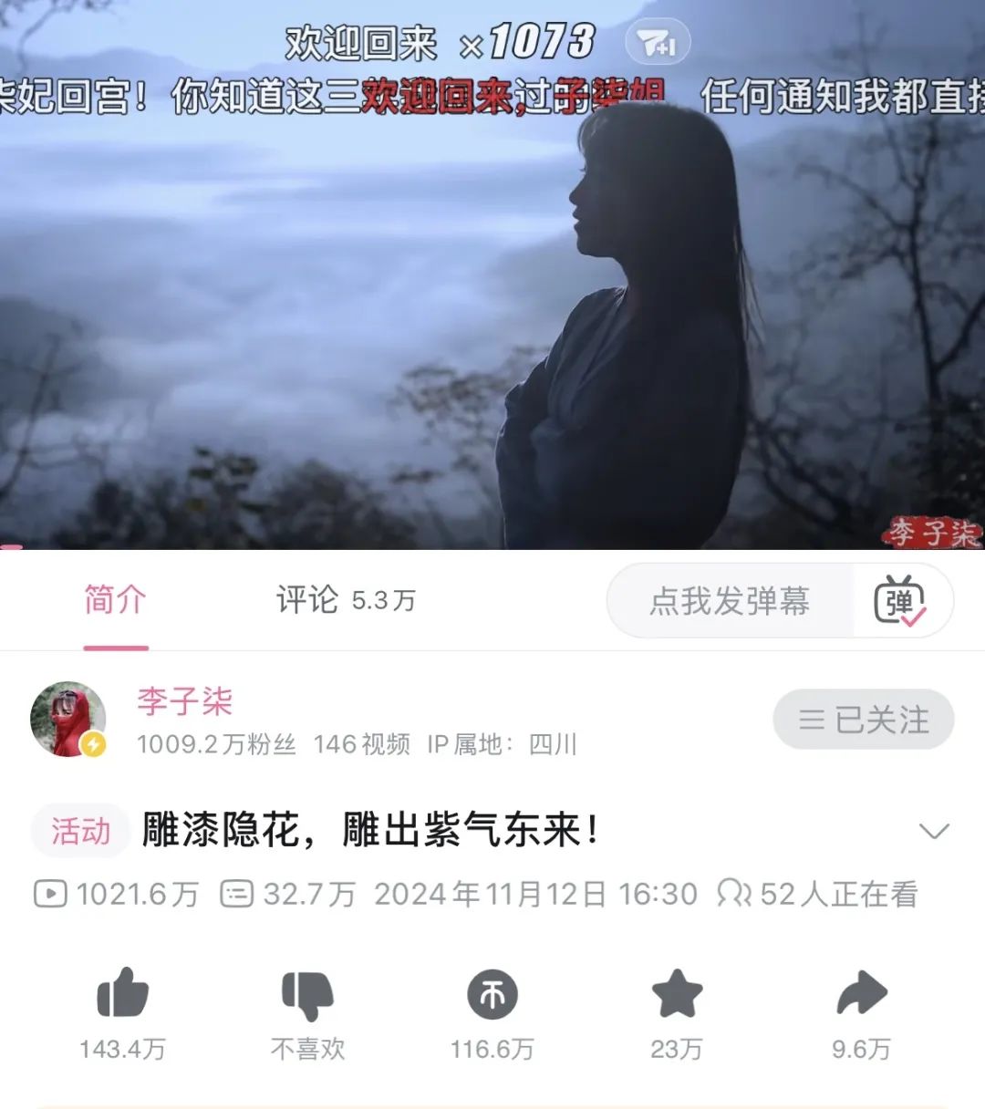 第二類是“有文化”。1個月之前,停更三年多的up主李子柒在各短視頻平臺宣布回歸,復更關于大漆技藝制作的視頻“雕漆隱花,雕出紫氣東來”,全平臺播放量過億,在評論區和彈幕區隨處可見“歡迎回來”“今夕是何年”“爺爺/奶奶,你關注的up主更新了”等網友留言,近乎形成了某種現象級的“集體狂歡”。