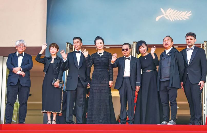 2024年5月18日,在法國南部小城戛納舉行的第七十七屆戛納國際電影節上,影片《風流一代》導演賈樟柯(右四)攜主創出席首映禮。新華社記者高靜攝