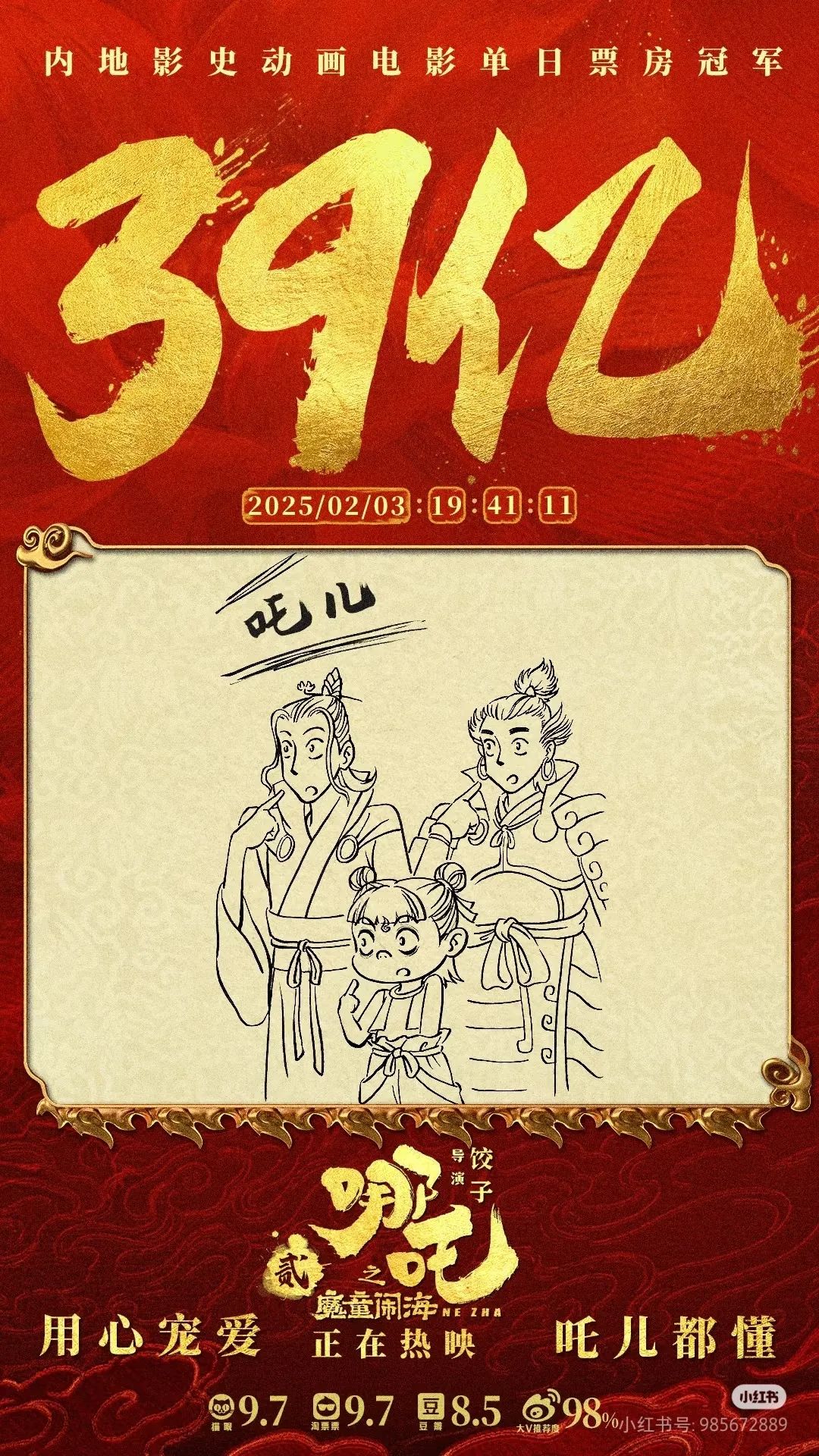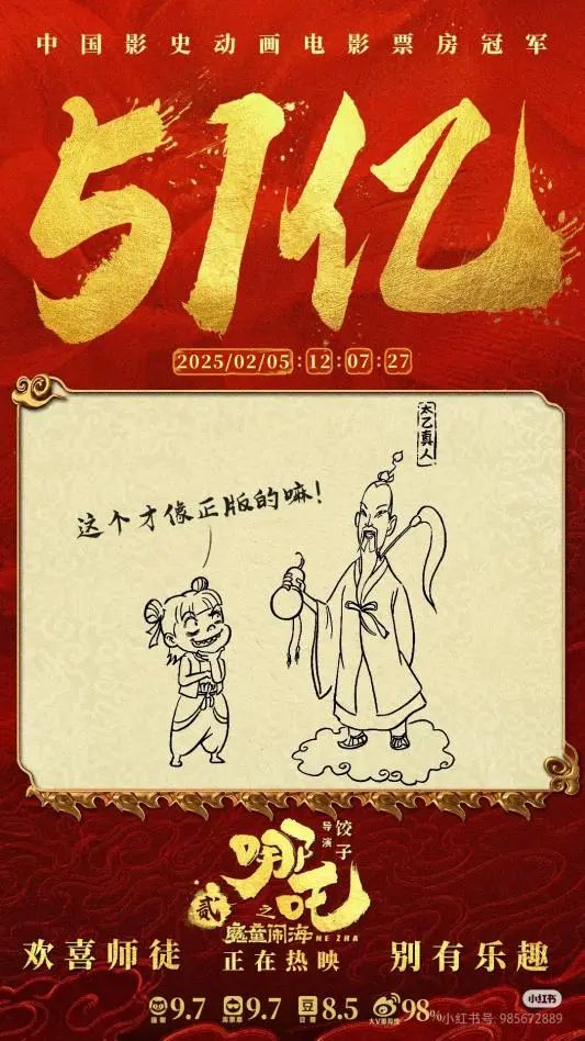 2025年春節期間,六部前期宣傳頗豐、影迷期盼已久的“重磅電影”同時上映,被稱為史上最強春節檔,競爭激烈可想而知。暌違五年,與偵探推理、神話史詩、武俠、軍事等各路強悍IP同場競技,作為中國影史動畫票房冠軍續作的《哪吒之魔童鬧?!穭萑缙浦?,粉碎“續作難出佳作”的魔咒,續寫了中國動畫影史的神話。據燈塔專業版數據顯示,截至2月6日,影片票房已突破58億元,超過《長津湖》成為中國影史票房第一,同時成為中國影史春節檔票房冠軍。與此同時,數據仍在不斷翻新當中,有網友戲稱,“吒兒的含金量還在不斷上升”,一盞茶的工夫,紀錄就有可能以億元為單位被不斷刷新。影片制作方之一彩條屋影業小紅書官方號甚至成為眾多影迷、網友“喊話”餃子導演的留言板,“正是拼的年紀,不能躺,快起來開拍哪吒三啦”。
