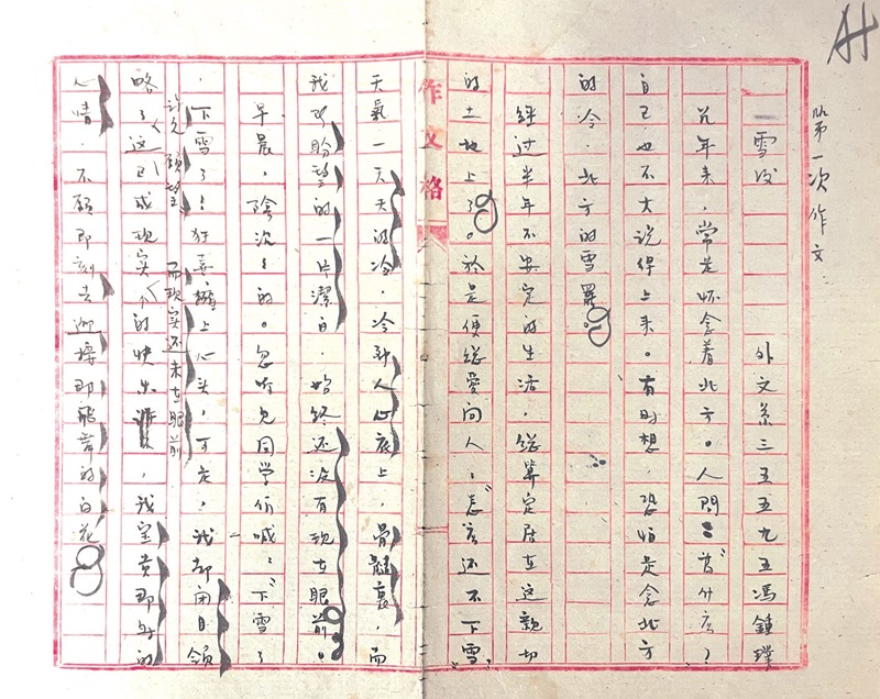 在《雪后》手稿首頁的最右側,豎行題寫著五個字:“第一次作文”。想來是作文發下來后,宗璞先生在上面寫的吧?