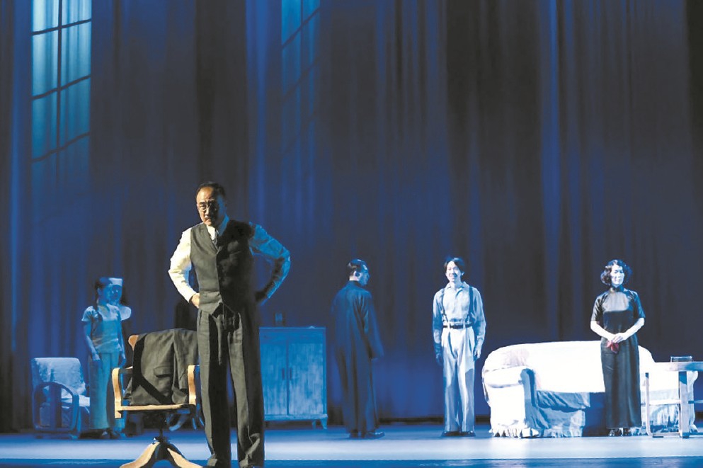 李六乙導演讓消失了幾十年的《雷雨》序幕重回舞臺,但他作出驚人的改編,侍萍偏坐一角,舞臺正中的位置留給周樸園,十年前的那場“雷雨”是周樸園視線下的“舊日重來”。十年后的除夕和十年前的夏日重合,瘋了的蘩漪和失語的侍萍在舞臺上,死去的四鳳、周萍和周沖也在舞臺上。成為醫院病室的周家客廳真成了鬧鬼的房子,醫院的兩個嬤嬤始終在場,隨時安撫著這些受了創傷的人和鬼,舞臺上的種種,既是活人破碎的回憶,也是群鬼重演往日的片段。曹禺渴望的巴赫《b小調彌撒》被換成了《馬勒第二交響曲》,并且不只出現在序幕和尾聲與侍萍有關的場景,“馬勒第二”的合唱段落縈繞在整晚的演出中。這部交響曲的另一個名字是“復活”,開始于“送葬”的主題,結束在“復活頌歌”,伴隨德語歌詞唱出“要相信啊,我的心,你并未失去所有,你擁有渴求的一切”。周樸園大聲朗誦起《圣經》。
