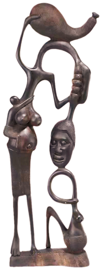 自1999年11月始,達斯塔尼的創作風格又有了新的變化和突破,他用不規則的木段做材料,根據木段本身的原始形狀,只在部分位置稍加雕琢,創作出一批風格鮮明的作品。有的僅在木料上動寥寥數刀就成就了一件經典之作,如烏木雕《祖母印象》,創作于1999年12月。有一天,達斯塔尼來到我們在達累斯薩拉姆的藝術基地,看見中國木匠正在我家木門上雕刻圖案,那是具有中國傳統風格的梅花鹿、仙鶴、松鼠,他對我說:“他們雕刻的是中國風格,我能雕出馬孔德風格的作品?!闭f罷就朝堆放木頭的地方奔去,從我們從鋸木廠運來的邊角料中選出一塊還帶著樹皮的長形烏木板。過了兩天,他興沖沖地來了,手里提著一個塑料袋,里邊就裝著這件名為《祖母印象》的作品。當打開袋子時,我開始感到詫異,為什么稱這件沒有任何具象表達的作品為“祖母”?我突然想到要換個思維模式欣賞它,于是瞇起雙眼,轉動大腦,細心體會——原來這是作者心中的祖母,一個婀娜嫵媚的美麗婦人。作者在作品中注入了對祖母的無限崇敬和欣賞,他通過《祖母印象》向世人傳遞著對女性的尊重與崇敬,這件雕塑也開創了馬孔德現代雕塑的新形式。