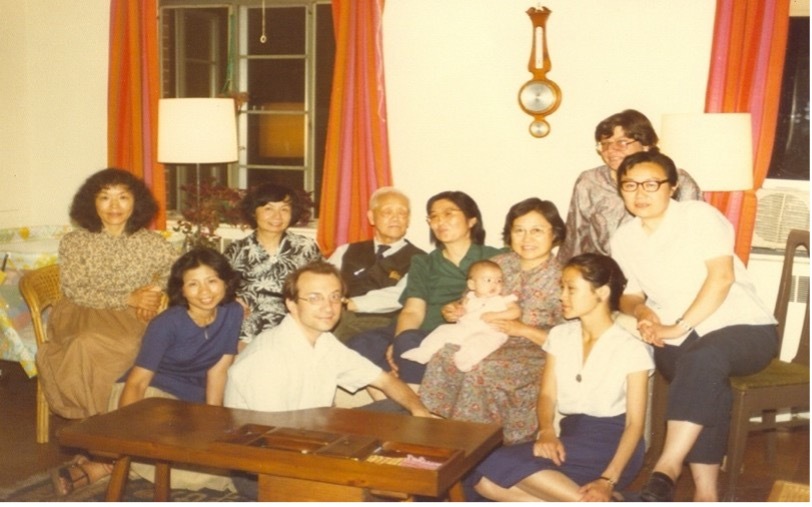 張立青、何謙、葉嘉瑩、艾朗諾、洪業、齊文穎、李卉(抱著艾瑞思)、周杉、Beatrice Spade、朱紅,麻省劍橋艾家,1980年。