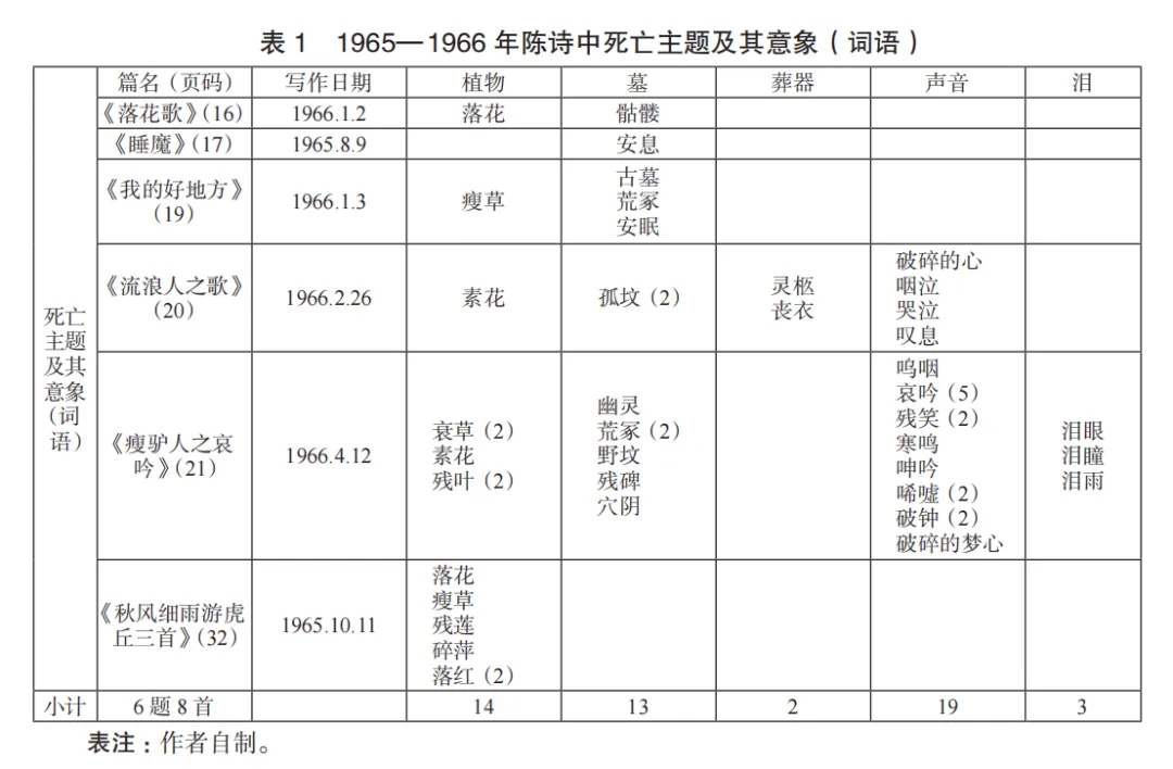 懸疑一,何謂陳對李詩的“心理相通”在19歲便先知先覺?有標識么?標識乃在陳當年鼻子特別靈,一下便嗅著李詩所彌散的特別“墓園氣息”,且吸進心坎,故其1965—1966年的象征詩幾被“死亡”主題及其意象(詞語)所覆蓋。謂予不信,請看表1。
