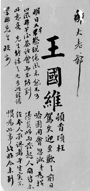 前文所述王國維名刺上的“短信”內容為:“頓首。頃枉駕失迎,至歉至歉。前日哈園開會,忽派弟為招待員,此與發起人皆未經本人承認者。平生實不慣為此事,故昨、今未到,明日又早祭,現傷風未愈,不可以風,并午后茶話會亦不能到,此意亮先生能諒之也。專此,敬請景叔先生晚安?!?/p>