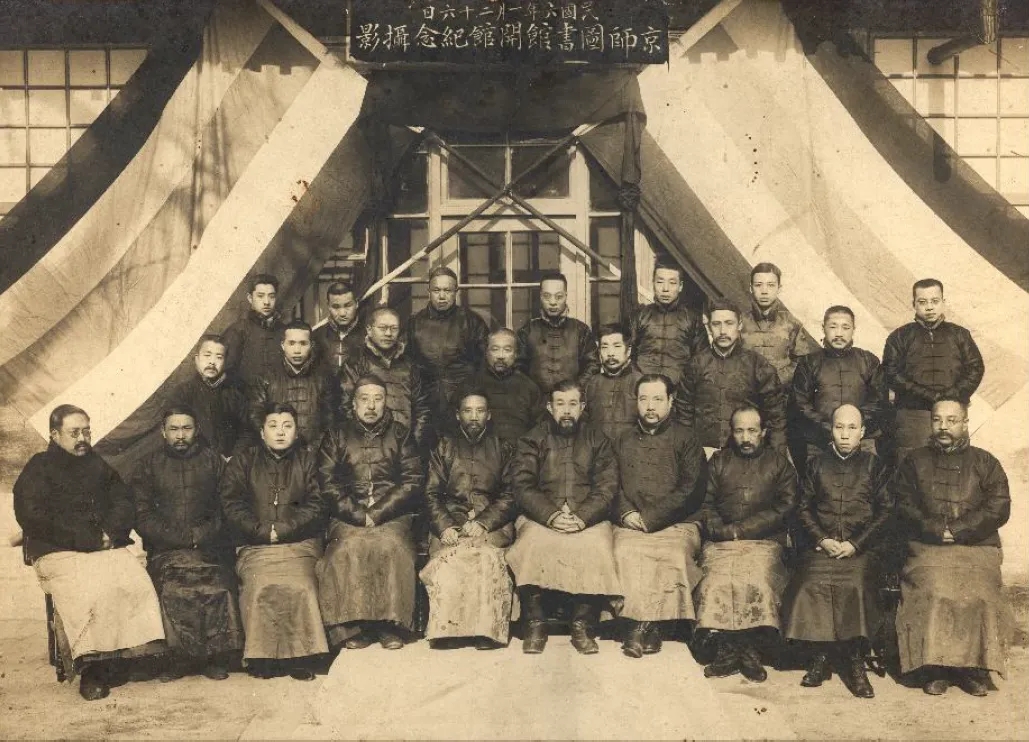 京師圖書館設立于1909年,最早位于廣化寺。經魯迅等多方努力,京師圖書館得以改建。1917年1月26日新館在方家胡同開館,這是開館紀念合影。二排左5為魯迅。