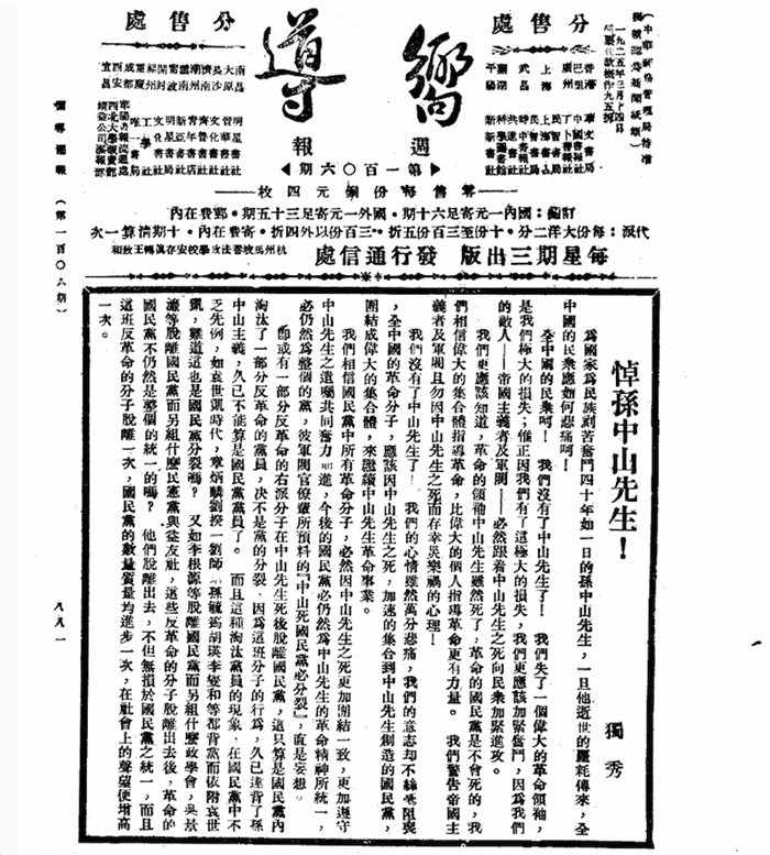 陳獨秀在《向導》第106期發表《悼孫中山先生!》一文