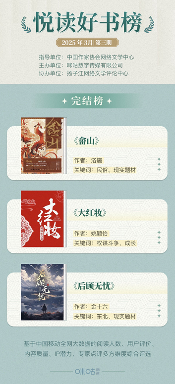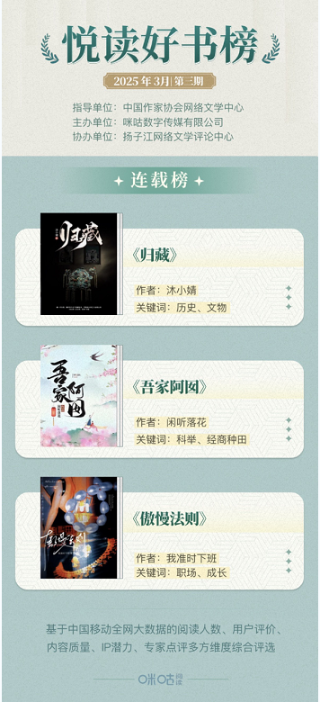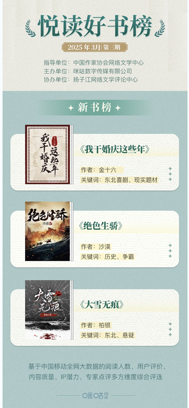 悅讀好書榜每月更新,誠邀廣大讀者、作家及出版從業者持續關注,共探網絡文學新圖景。咪咕閱讀將持續深耕優質內容創作生態,搭建創作指導平臺,強化內容生態建設,通過專業化服務體系助力文學創作與閱讀體驗的雙向提升。與此同時,深化作品IP價值開發,探索文學創新表達路徑,構建多方協同的產業生態,促進行業生態良性發展。