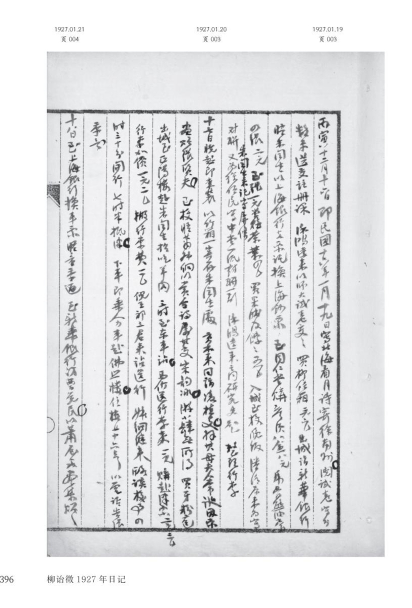 《日記》在詳載先生勤勉不懈、真誠坦率和溫馨親情方方面面的同時,也真實再現了先生親歷的風云變幻,內容殷實,頗值查究。1925年3月,東南大學爆發“易長風潮”,先生牽涉其中,憤而北上,輾轉東北大學、北京女子大學和北京高等師范學校等處。1927年1月19日,也就是本冊日記的開篇,先生完成當日手頭工作,便即行整拾行裝,于次日下午4時半,從正陽門搭乘火車經天津南歸,顛沛流離的北漂生活至此畫上句號。23日上午火車抵寧,短暫停留便再次搭乘火車返回故里鎮江。