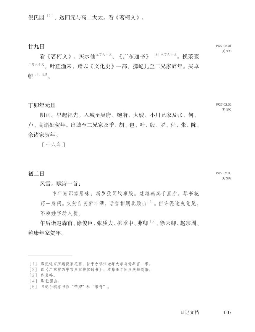 《柳詒徵1927年日記》的時間跨度為1927年1月至1928年1月,其中記載了這一年作者親歷的家國要聞、交游往還、治學日常及家庭親情。書中收錄了柳氏已刊、未刊詩文手稿,日記內容還涉及蔡元培、陳三立、陳寅恪、陳垣、胡剛復、竺可楨等學界名流,以及民國時期高等教育改革、圖書館事業建設等歷史細節。此外,本書采用日記釋文與影印底本對照編纂方式,并附有“人物簡介”“人名索引”等檢索內容,兼顧學術研究與文獻保存需求。