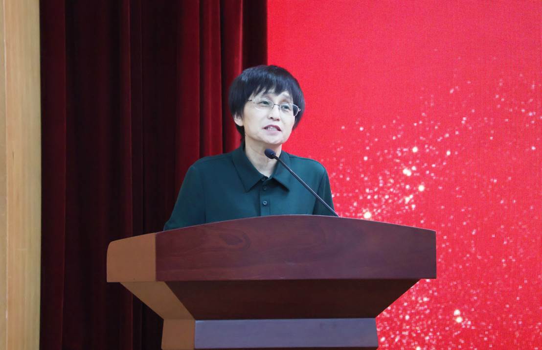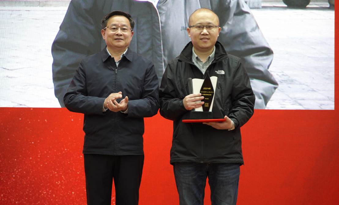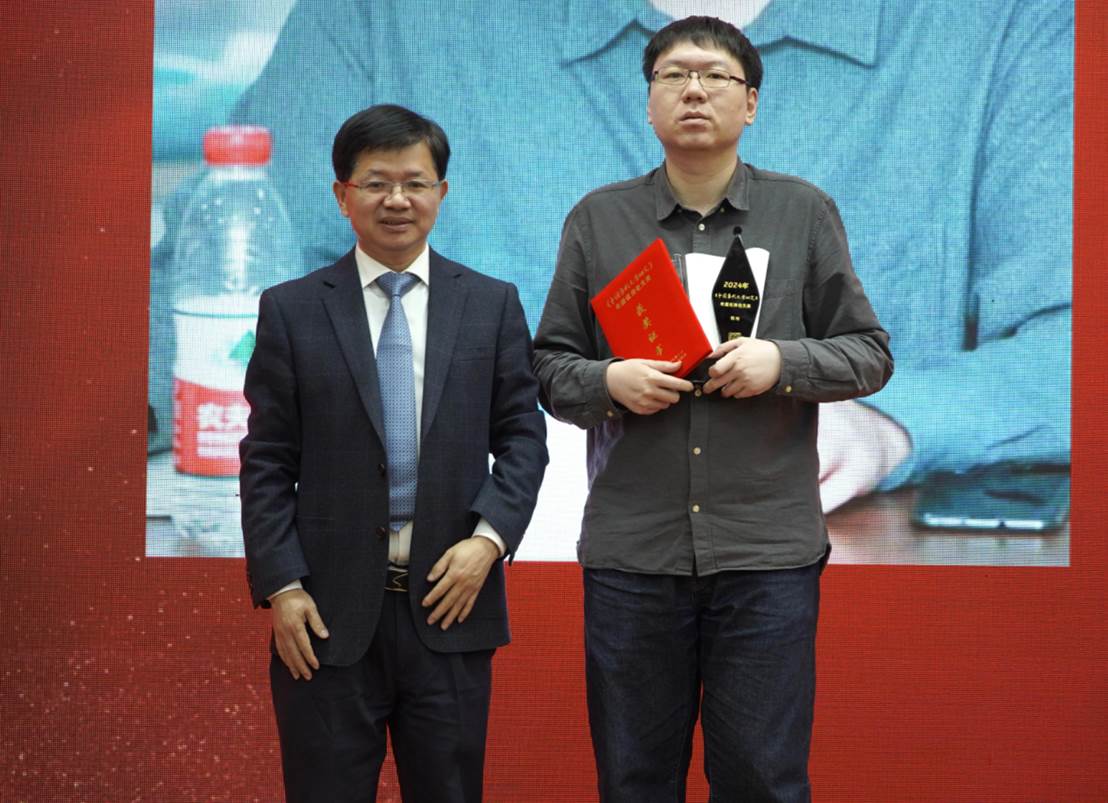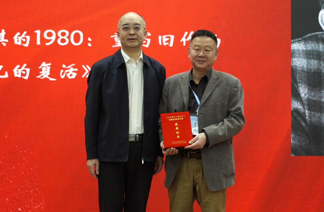 山東出版集團黨委書記、董事長劉文強為賀桂梅頒獎(山東大學文學院研究員尹林代領)
