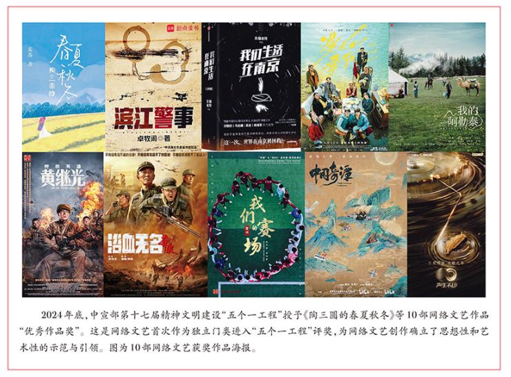 2024年底,中宣部第十七屆精神文明建設“五個一工程”授予《陶三圓的春夏秋冬》、《濱江警事》(第1部)、《我們生活在南京》3部網絡文學作品,《漫長的季節》、《我的阿勒泰》2部網絡劇,《特級英雄黃繼光》、《浴血無名·奔襲》2部網絡電影,系列紀錄片《我們的賽場》、網絡動畫片《中國奇譚》和網絡綜藝節目《聲生不息·寶島季》等10部網絡文藝作品“優秀作品獎”。這是網絡文藝首次作為獨立門類進入“五個一工程”評獎,為網絡文藝創作確立了思想性和藝術性的示范與引領。