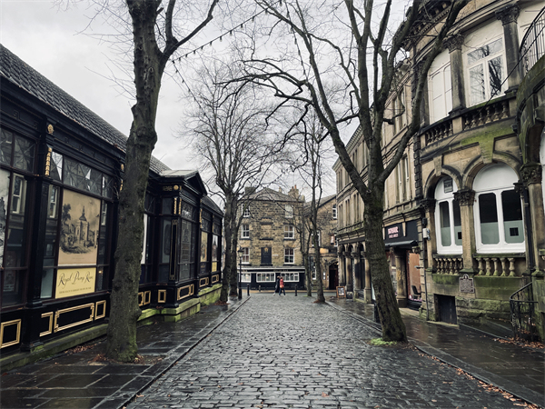 往哈羅蓋特去的火車上,窗外風景逐漸從城市轉為典型的英格蘭鄉村景觀,間或點綴著林地,雖已上午10點多,但冬日的晨霧還未散盡,陽光射下來,顯得頗有仙氣。哈羅蓋特給人的第一印象相當好,街道是整齊的維多利亞時期建筑,沒有礙眼的新樓房,這里曾經連續三年被選為英國“最樂居城市”。自16世紀此地發現溫泉以來,這里就成了全英國聞名的療養地,富人們拖著病體接踵而至,也讓城市財富得以積累。一圈走下來感覺這里明顯是流淌著“老錢”的地方,當地人似乎對自己的城市歷史非常自豪,幾乎每走幾步就會看到建筑物上掛著銘記歷史的“藍牌”——不過這兒統一用的是棕色底。