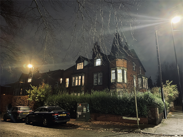 根據《托爾金傳》中的簡略記錄,1924年,32歲的托爾金獲得利茲大學的教授席位,“這個歲數以英國大學的標準,算得上相當年輕”(卡彭特,《托爾金傳》)。同年,他和伊迪絲買下了市郊達恩利路(Darnley Road)2號的房子,四周有開闊的田野,相比污染嚴重的市中心,托爾金一家的居住環境大為改善。達恩利路位于利茲西北邊,剛好在哈羅蓋特回利茲的火車線上,可以在黑丁利站(Headingley)下車,步行大約半小時,不過冬日天色暗得早,我決定搭公交車過去。達恩利路所在的威斯特帕克(West Park)一帶是典型的城郊中產住宅區,一幢接一幢小房子,門口是修剪整齊的矮樹籬,這個冬天周六的傍晚,路上一個行人都沒有。達恩利路2號這房子似乎比周邊的還更氣派一些,兩層樓高,還有尖尖的閣樓,前院不僅停了一輛車,邊上還有一小片草坪和花壇。房子燈火通明,從為車道留出的樹籬缺口可以看到,底樓一扇窗邊掛了藍色圓牌,那看起來是廚房的窗,一位女士似乎在窗邊的水池洗菜。這樣居家的場景,倒讓我想起《魔戒》故事的結尾,“而山姆轉往傍水鎮,就這樣,他再次在一天將盡之時回到了小丘。他往前走,那里有暖黃的燈光,屋內有爐火,晚餐已經備好,家人正在等待?!保ㄍ袪柦?,《魔戒》,卷六第九章)整整一個世紀之前,托爾金每天從利茲大學回到家中,是否也會見到如此的溫馨場景?車道入口離房子距離頗遠,站在樹籬邊根本看不清藍牌上的字,但我在那兒徘徊良久,一心希望能和屋內的人對視,然后獲得進院子拍照的默許,只是今天這位傍晚五點不到就在廚房忙碌的女士專心致志,絲毫沒留意到外面的情形。在寒風中猶豫了一會兒,還是拍到照片的欲望占了上風,于是繞過停著的汽車私入院子來到墻邊,近距離拍下那塊紀念托爾金在此居住的藍牌。