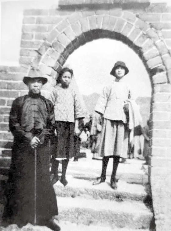 林徽因(右)與梁啟超(左)、梁思莊(中)游覽長城