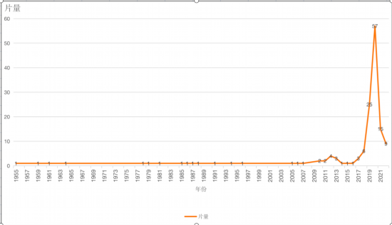 2021年底,我確定以涼山本土的影像創作為自己的研究方向,觀察有關彝族的影像創作。截止到2022年筆者進入田野并進行資料整理時,發現當時涼山已經產生了大量彝族自我生產的、以母語電影為外殼、展現彝族人生活、傳遞自身價值觀的影片,累計至少有149部,并且曾經呈現出增長的趨勢(如下圖),而為何會出現2021年這種暴增現象?這是當時的疑問。