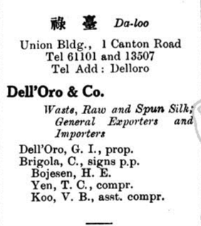 嚴智珠1929年完成學業后和妻兒回國,1930年5月1日起,出任意商臺祿洋行華經理。和李開第不同,嚴智珠學的是紡織,臺祿洋行(Dell'Oro & Co.),位于廣東路1號,主要經營絹絲線進出口業務。