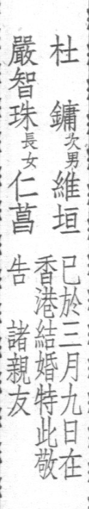 按照杜月笙幼子杜維善的口述,杜家兒女的婚事基本由杜月笙決定,杜維垣很聽父親的話,他也生于1921年,一直在美國讀書,抗戰勝利后學成回國,杜月笙要他跟嚴家小姐結婚,他就奉命結了婚。不過杜維善比杜維垣小12歲,自述戰后杜維垣回國自己才第一次見到他,他婚后不久又走了,以后一直在美國的聯合國文教處工作??梢娦值荛g了解極少。杜維善還說過他二嫂、五嫂都是嚴家仁字輩的,大概是表姐妹或堂姐妹,二嫂結婚后妹妹也嫁到了杜家。這些都明顯有誤。嚴智多女兒嚴仁蕓確實比嚴仁菖小了五歲,但是早一年嫁進杜家。杜維垣一直在美國讀書,戰后拿到教育碩士學位后回國,1947年1月當選為上海嵩山區區長??箲饎倮蠖旁麦显氐缴虾?,由于身體原因又去了香港養病,2月20日,杜維垣飛去香港。當時上海小報報道了這一消息,認為杜維垣是去向父親報告近期上海的商務狀況。同機去港的還有他當時的未婚妻嚴仁菖及其父母嚴智珠夫婦。但其實這次去香港主要是為了辦婚禮。3月9日,杜維垣嚴仁菖結婚。第二天的上海大報上登了杜月笙和嚴智珠聯名宣布的消息: