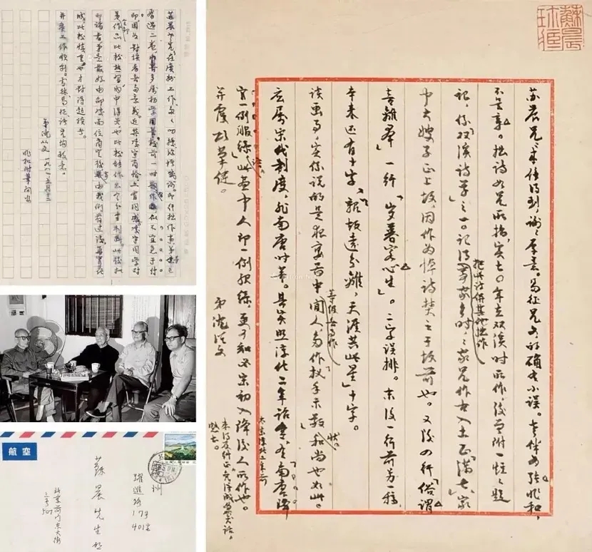 1981年5月12日信,是沈從文訪美回國,取道香港、廣州、長沙,于是年4月16日返京后寫給蘇晨的。一來對在廣州期間的叨擾表示感謝,二來在翻閱花城版《文集》的兩卷初樣后,認為早期習作較多,不宜急于印行,并告知此后由凌宇、邵華強負責編選(此點在其他書信中也多有提及)。信中值得一說的是所謂“叨擾”,這涉及到沈從文在廣州期間與容庚、商承祚的交游,此前的研究資料及《年譜》均有遺漏。據《年譜》記載,1981年4月2日,沈從文由王序、王亞蓉陪同前往中山大學拜訪容庚、商承祚。其實沈從文在廣州期間,與容庚、商承祚還有過一次會晤,據蘇晨《想起窄而霉小齋沈從文》記敘,沈從文某日打電話要到他家做客,蘇知道容商是沈的朋友,便告知沈其與容商也是熟人,便也約了容商二人,使沈容商三老在蘇宅會面。與1981年5月12日信拍出的還有一張蘇晨與三老的合影,從蘇晨的描述,其家客廳掛有沈從文所書四百字的“琴條”,這也在照片中可以得到應證。據筆者判斷,沈從文這次在蘇宅與容商的會面,應該早于4月2日在中山大學的會面,一來4月4日沈從文便離開了廣州,時間倉促,不可能在兩天之內會面兩次;二來赴容商所居的中山大學拜訪,更具禮數,也算是對蘇宅會面的一次“回訪”。