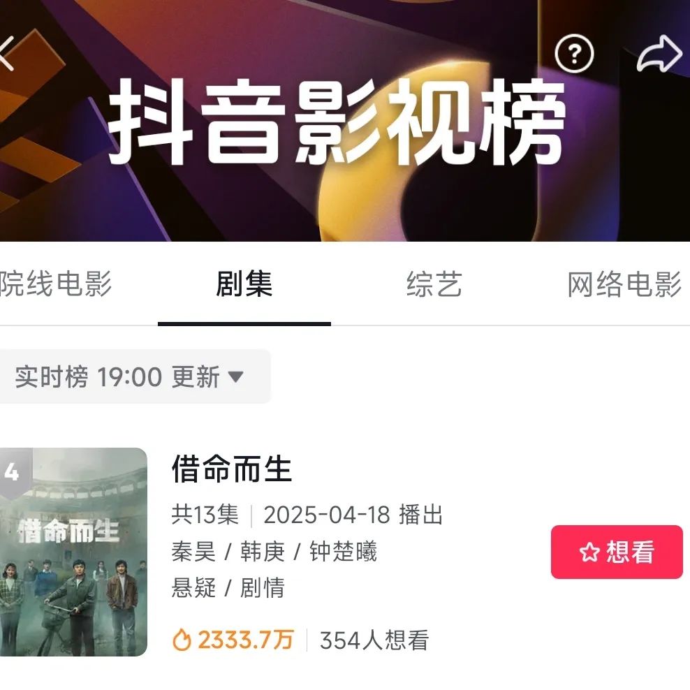 臨近開播,電視劇《借命而生》愛奇藝預約量突破150萬,抖音劇集榜熱度值達2333.7萬。